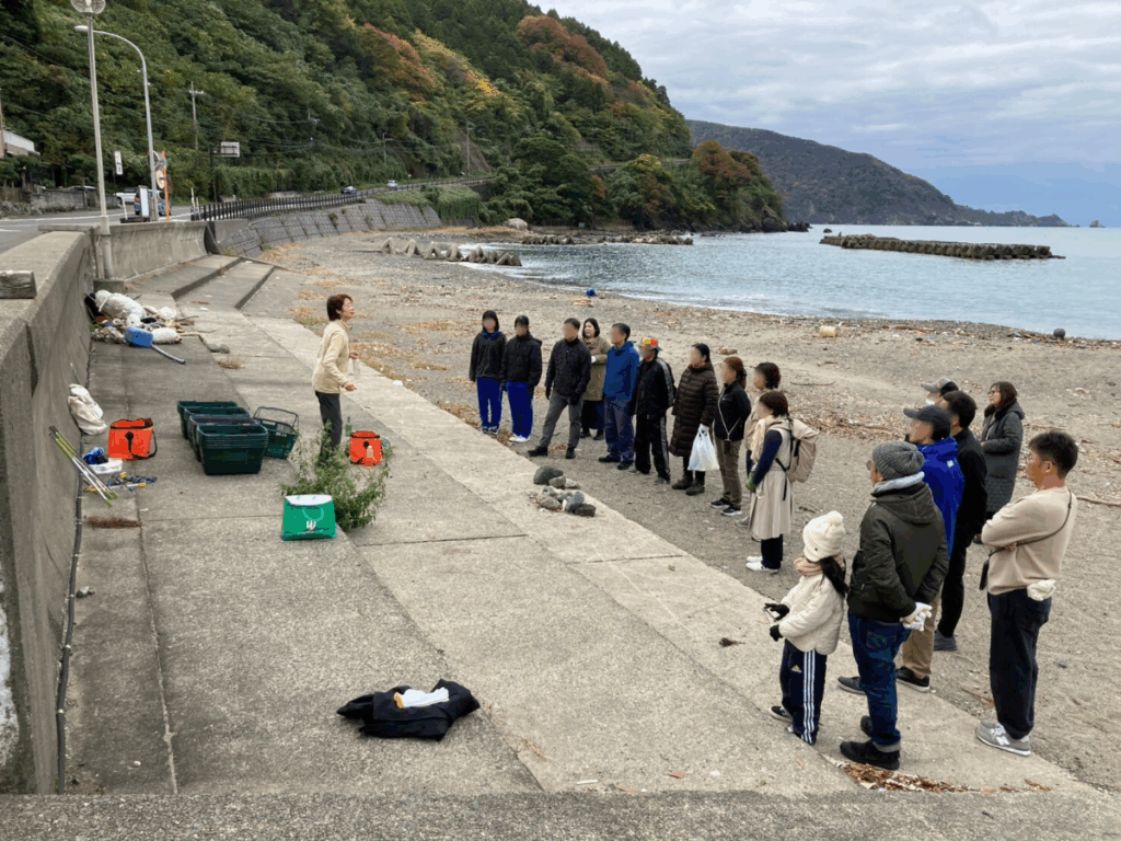 世久見海岸に到着後、西野さんからごみの拾い方・分別のポイントについて説明を受け、清掃活動がスタートしました。