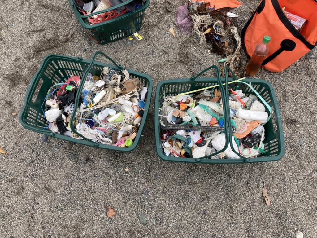 人工物に絞って拾ったにもかかわらず、かごいっぱいのプラスチック容器・漁具・プラスチック片が集まり、その量に改めて驚かされました。