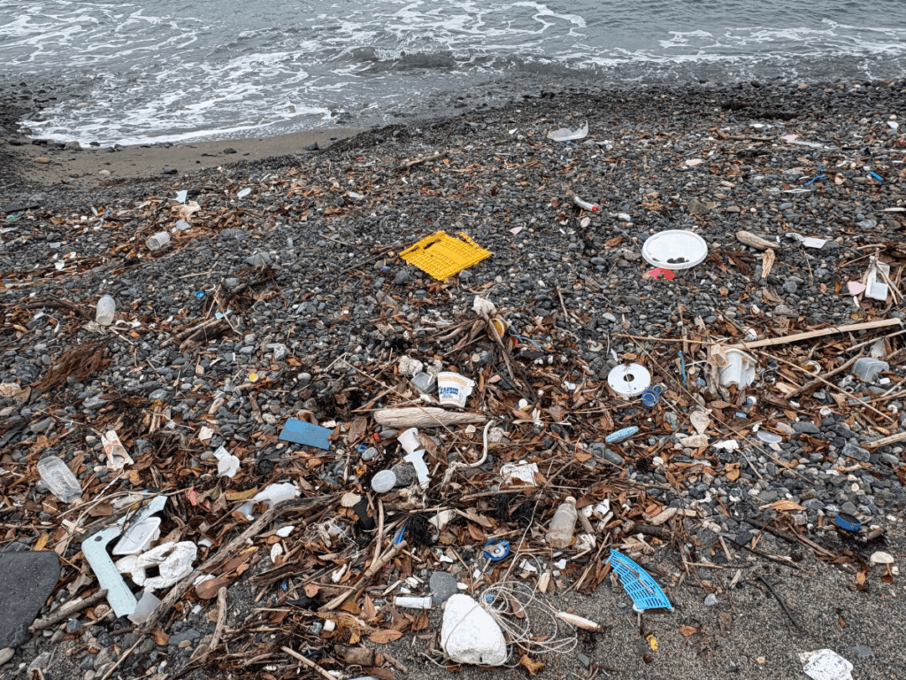 清掃前の海岸は、人工ごみや漁具、大きな破片があちこちに散乱し、自然の風景と人工物が混ざり合った状態でした。