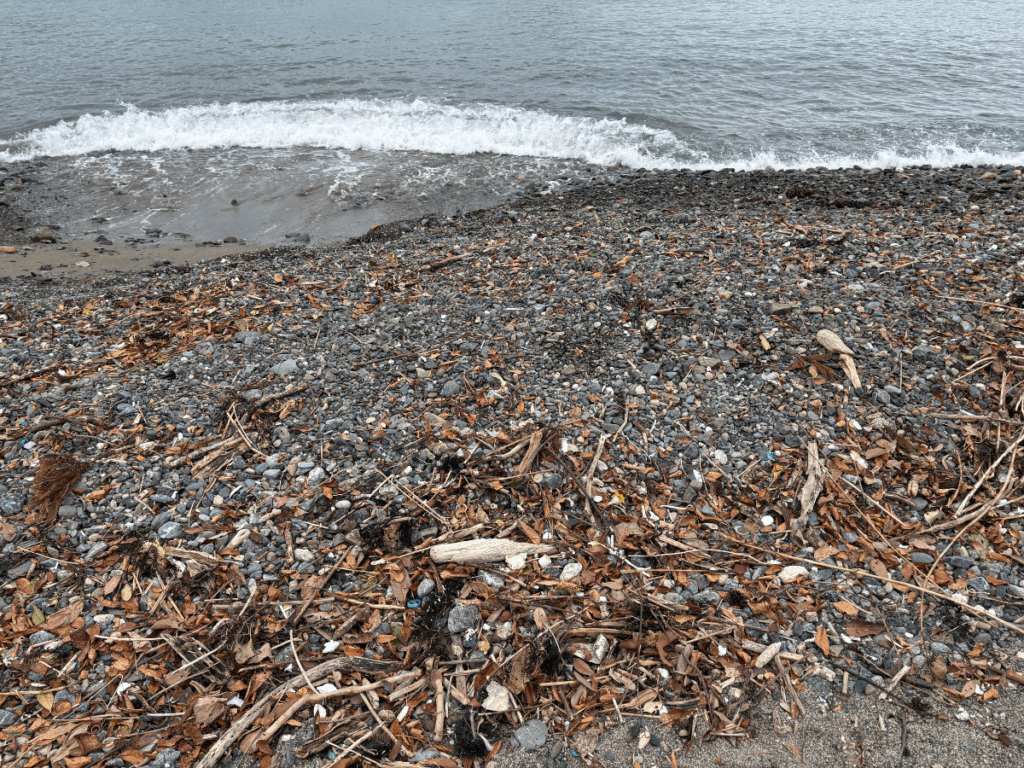 世久見海岸は一見すると美しい海ですが、足元を見ると、大小様々な人工ごみが砂利の間に入り込み、漂着物が帯状に堆積している場所も多く見られます。